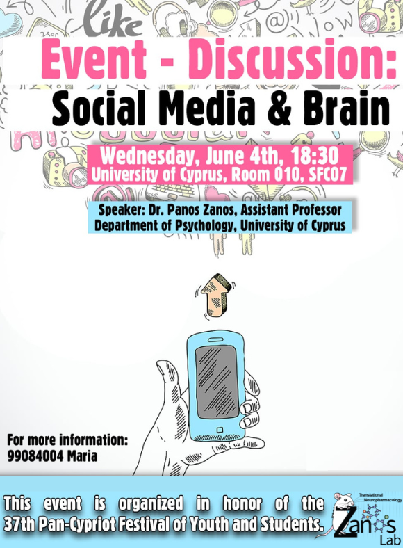 Dr. Panos Zanos delivered an engaging discussion on “Social Media & Brain” as part of the 37th Pan-Cypriot Festival of Youth and Students. The talk explored the fascinating intersection between our digital habits and neurological processes, including insights from current research on how social media platforms influence brain function, potentially covering topics such as dopamine reward pathways, attention mechanisms, and the neurobiological basis of social media engagement. This timely discussion addressed one of the most pressing questions of our digital age: how does our constant connectivity with social media platforms reshape our brains?