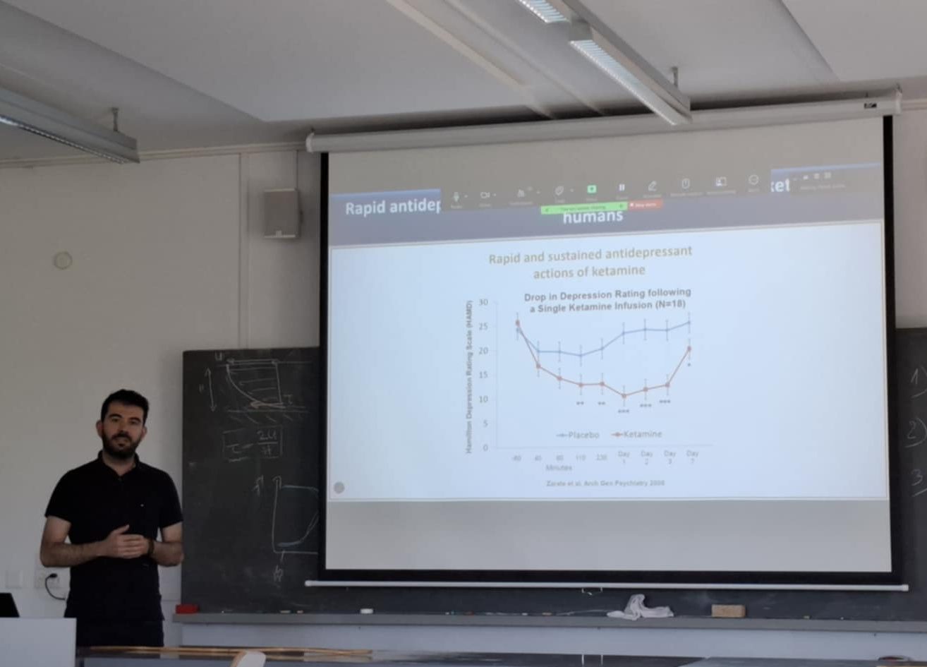 Dr. Zanos presented the lab’s cutting-edge research on ketamine’s antidepressant properties, challenging the conventional understanding of its mechanism of action. While ketamine has revolutionized depression treatment with its ability to alleviate symptoms within hours (compared to weeks for traditional antidepressants), its clinical applications have been limited by side effects.