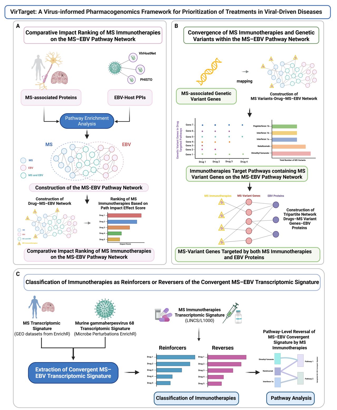 While EBV is increasingly recognized as a central driver of MS, current immunotherapies are prescribed without considering their effects on viral-host interactions or how they modulate EBV-related genetic risk factors. To address this critical gap, VirTarget integrates three complementary analytical layers: EBV-host interactomics mapping viral-host protein interactions within MS-relevant pathways, host genetic susceptibility linking MS risk variants to EBV-targeted therapy-modulated networks, and transcriptomic directionality analysis that classifies therapies as reinforcers or reversers of the MS-EBV signature.