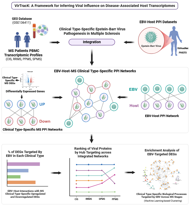 VirTrack is a systems bioinformatics framework developed by Dr. Anna Onisiforou and published as a preprint in October 2025. The framework is designed to infer the influence of viral infections on host molecular pathways by integrating virus–host protein–protein interaction (PPI) networks with disease-specific transcriptomic data. Unlike traditional static network approaches, VirTrack enables a disease-stage–resolved analysis of how viral proteins perturb host biological processes. In its primary application, VirTrack was used to investigate the role of Epstein–Barr virus (EBV) across different clinical types of Multiple Sclerosis (MS), revealing stage-dependent patterns of viral influence on host molecular networks. By identifying viral–host interactions and pathways associated with distinct disease stages, the framework provides a computational strategy for stage-tailored therapeutic targeting. VirTrack supports the development of precision antiviral and immunomodulatory strategies that account for evolving virus–host dynamics throughout disease progression. While initially applied to Multiple Sclerosis, the framework is designed to be generalizable for investigating viral contributions to a broad range of complex human diseases.
