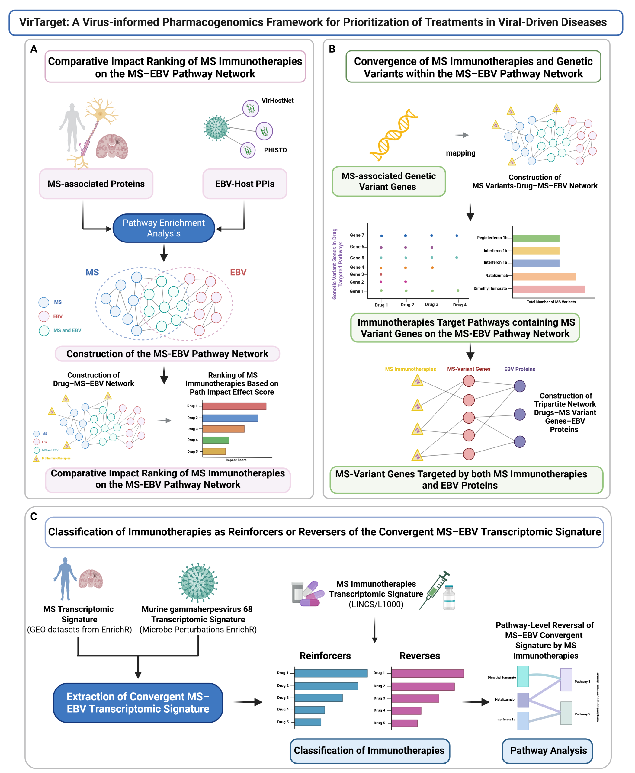 VirTarget is a virus-informed pharmacogenomics framework developed by Dr. Anna Onisiforou and colleagues from the USA and published as a preprint in 2025. The framework evaluates how MS immunotherapies interact with EBV–driven disease mechanisms by integrating EBV–host protein interaction networks, MS genetic susceptibility loci, and drug-induced transcriptomic responses. VirTarget addresses a central challenge in MS treatment, the “immunosuppression paradox”, where therapies are selected for immune suppression without considering their effects on viral biology. By classifying therapies as “reversers” (counteracting EBV-driven dysregulation) or “reinforcers” (potentially supporting viral pathways), the framework reveals how different drugs engage with virus-associated molecular networks. By identifying therapies that most effectively counteract EBV-related dysregulation, VirTarget moves MS therapy beyond a one-size-fits-all immunosuppression model toward virus-informed precision medicine, providing a roadmap for selecting treatments based on a patient’s viral and genetic profile and guiding the development of future immunotherapies that suppress disease without giving the underlying virus a biological advantage.
